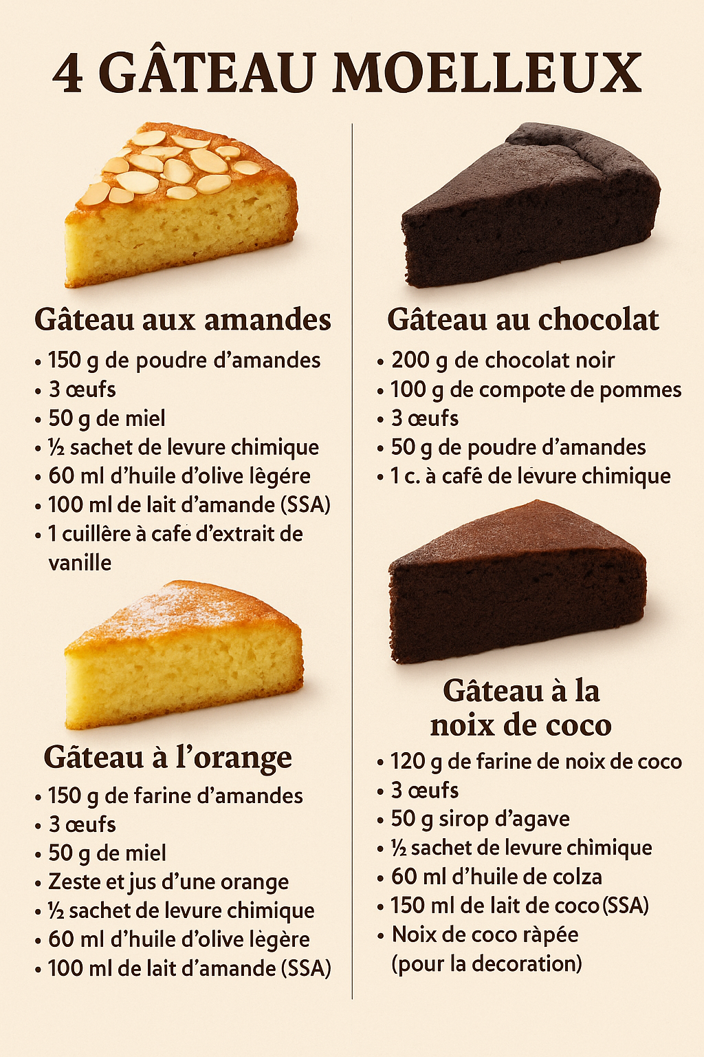Préparer un gâteau maison est l’une des plus belles façons de se faire plaisir tout en contrôlant les ingrédients que l’on utilise. Que ce soit pour un goûter en famille, un dessert improvisé ou une pause sucrée dans la journée, les gâteaux simples et naturels rencontrent toujours un franc succès. Dans cet article, vous découvrirez quatre recettes faciles à réaliser, sans excès de sucre, avec des ingrédients bruts et un minimum d’étapes. Ces gâteaux ont chacun leur caractère : la douceur enveloppante de l’amande, l’intensité profonde du chocolat, la fraîcheur fruitée de l’orange et l’exotisme délicat de la noix de coco.